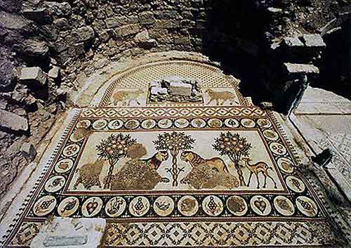 The picture maps in the mosaic floor of St Stephen's Church of several Palestinian and Egyptian towns in the former Byzantine Empire are identified by their place names in Greek script. These are of particular significance both artistically and as a geographical record. Other mosaic church floors including at the Church of the Lions, the Church of Bishop Sergius, the Church of the Rivers, the Church of the Palm Tree, the Church of Bishop Paul and the Church of the Priest Wa'il depict birds and animals, fishermen and hunters incorporated into extensive geometric mosaic carpets.